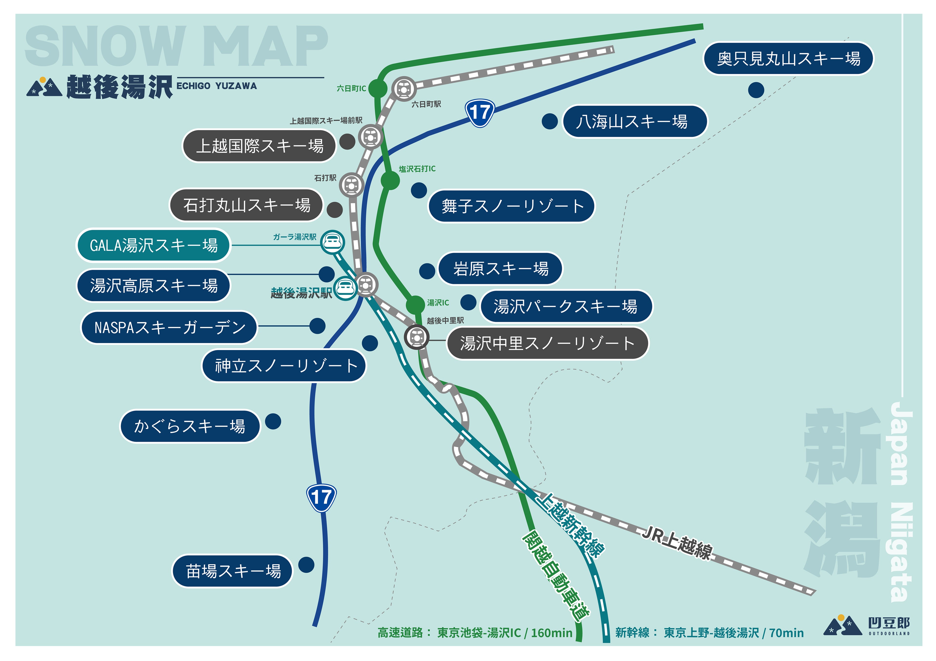 「岩原スキー場」は越後湯沢駅から車で約10分。緩やかな斜面が多く、幅広で真っ直ぐな雪道なので、初心者でも安心して練習できます!