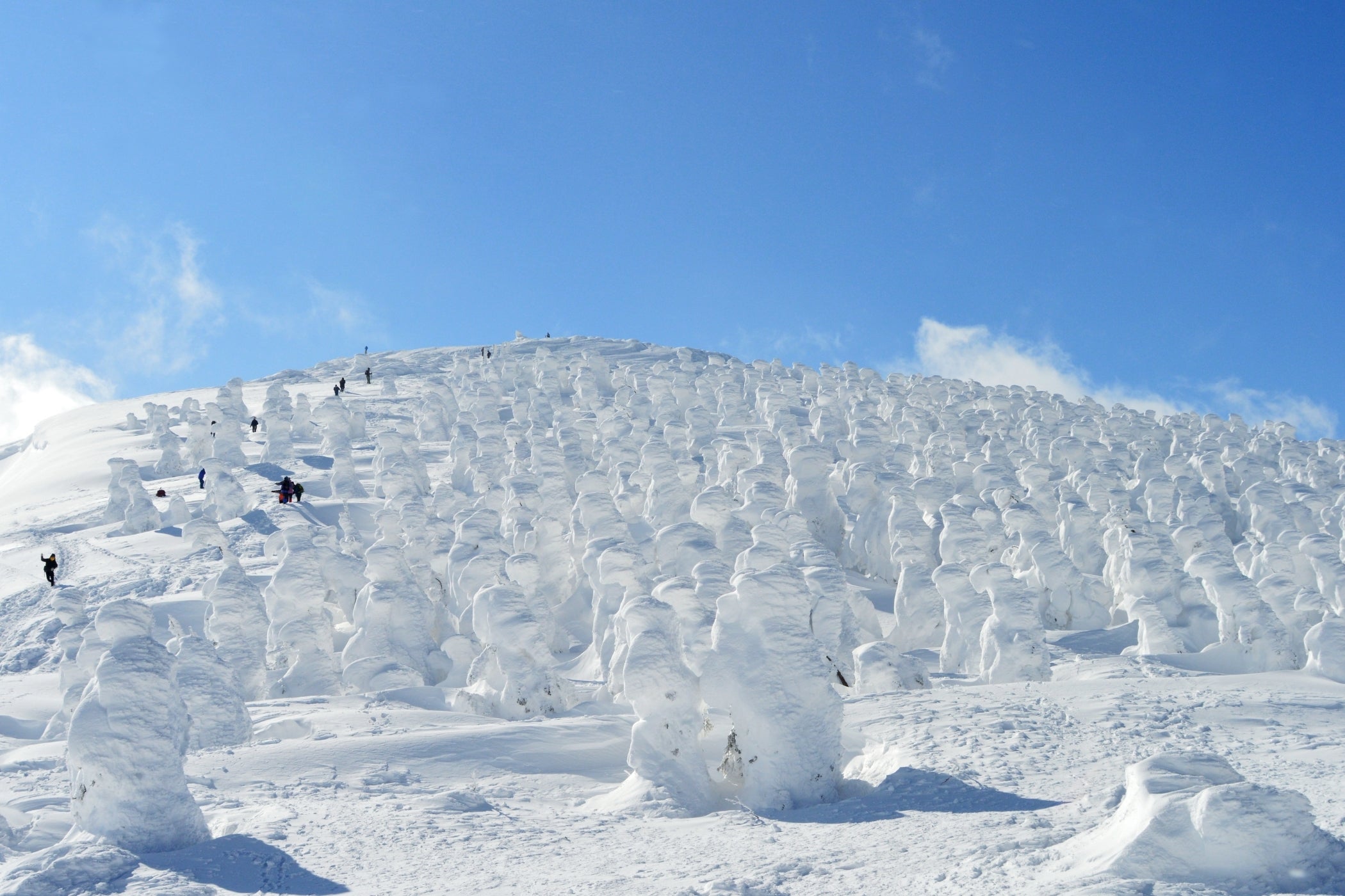 山形藏王以冬季限定的「樹冰」聞名世界,是因強風與水氣在針葉林上凝結而成的自然奇觀,被譽為「雪怪」。搭乘纜車登頂觀賞壯麗的樹冰群,是絕無僅有的體驗。